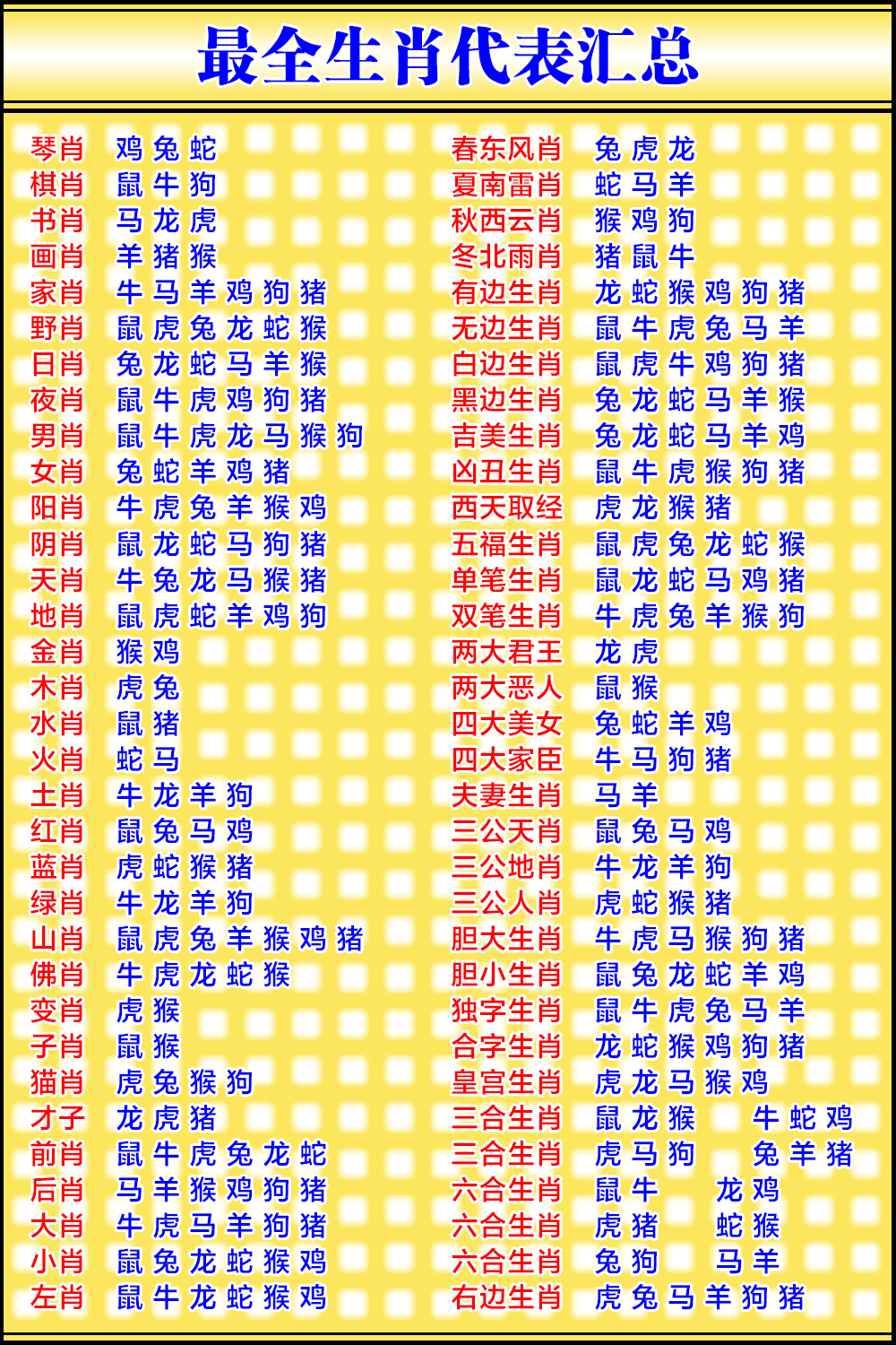 肉肖:虎-蛇-龙-狗 菜肖:猪-鼠-鸡-猴 草肖:牛-羊-马-兔 |